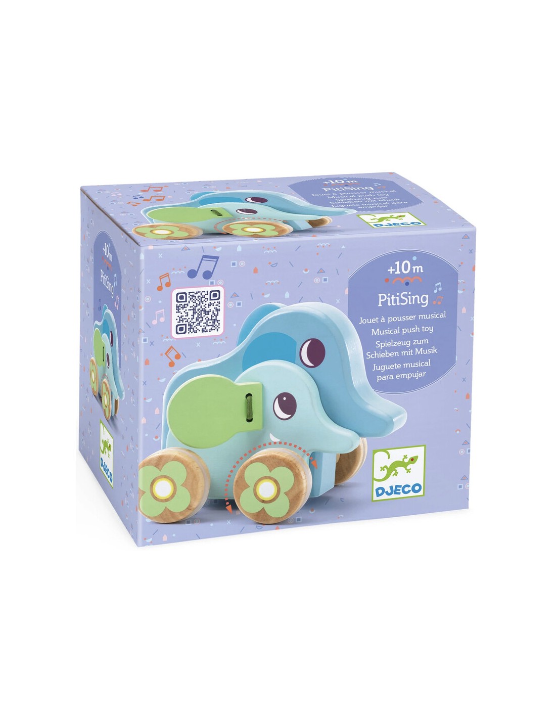 Los pequeños elefantes de madera sobre ruedas tocan una dulce melodía cuando ruedan. El juguete contiene una caja de música mecánica (sin electrónica). La música suena cuando el juguete se mueve hacia adelante o hacia atrás. El bebé se divertirá moviendo al animal para escuchar la bonita melodía de "Frère Jacques".